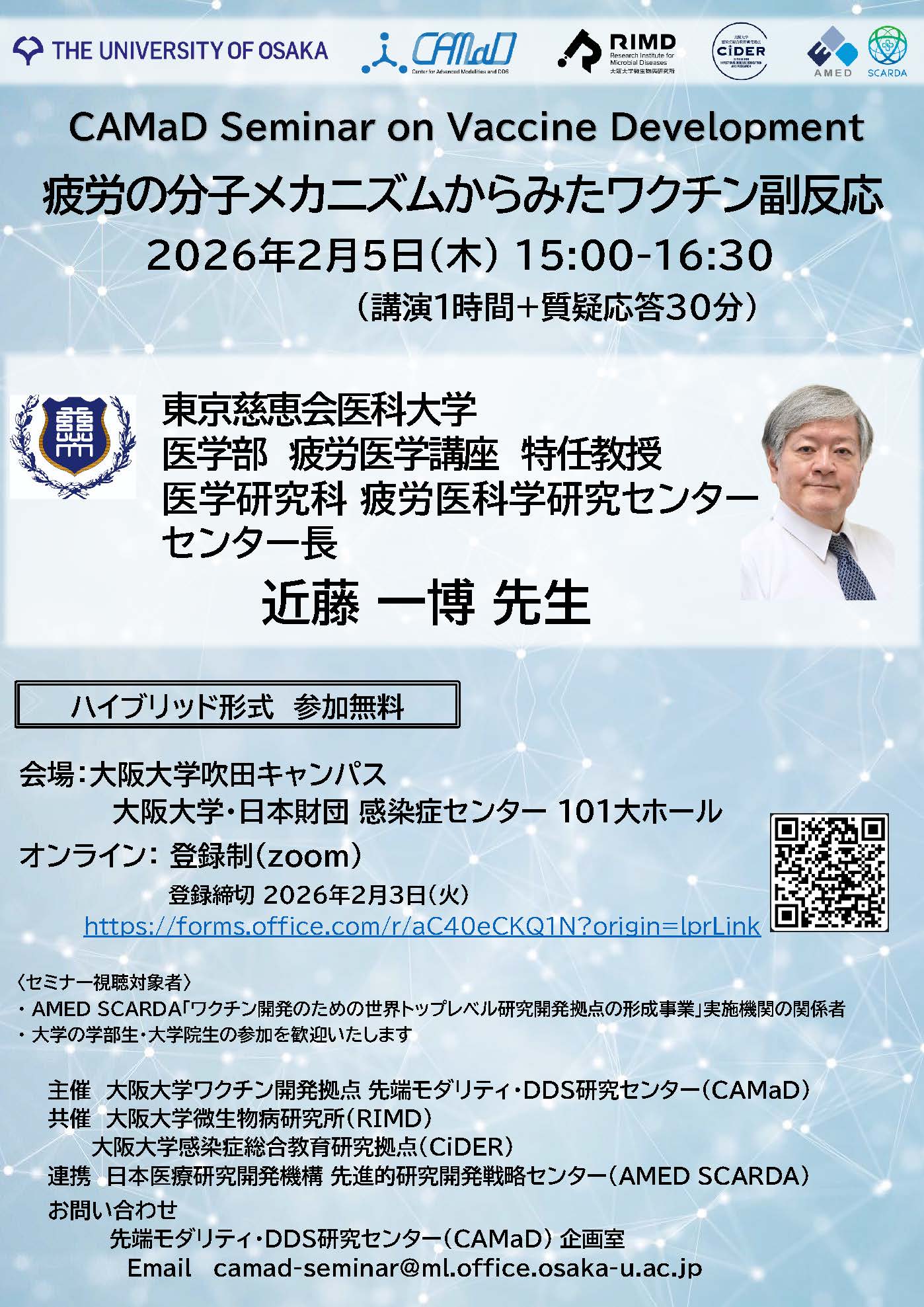 大阪大学ワクチン開発拠点 先端モダリティ・DDS研究センター(CAMaD)は、感染症ワクチン開発に関する人材育成及び最新の情報収集等を目的として、セミナーを開催します。