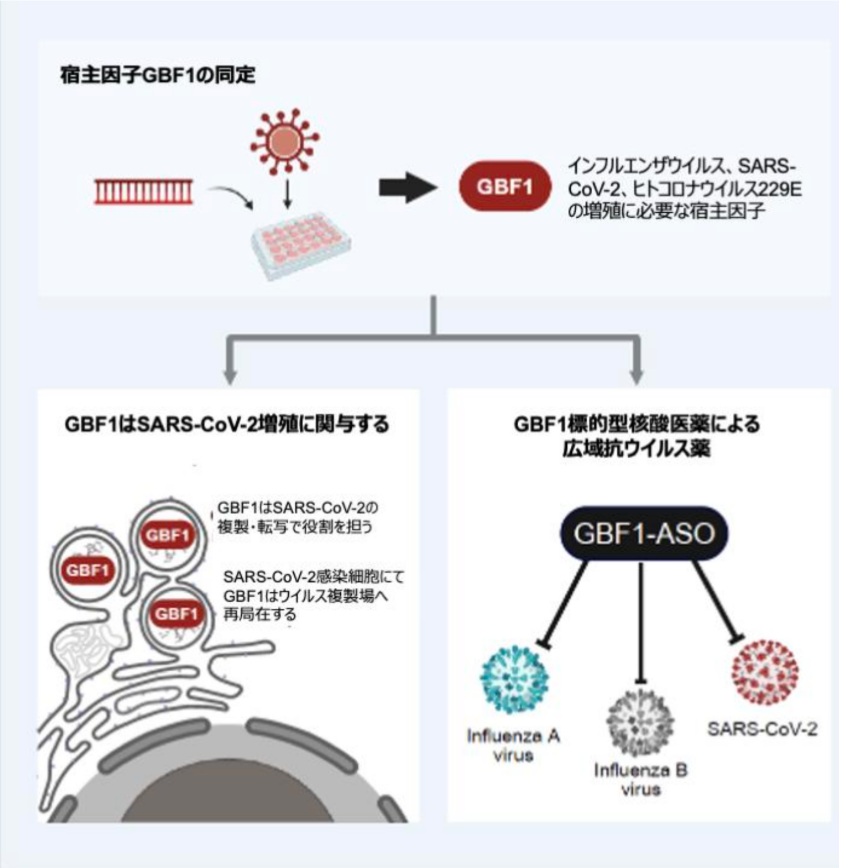 変異に左右されにくい新しい抗ウイルス戦略-宿主因子GBF1を標的とする核酸医薬がインフルエンザウイルスと新型コロナウイルスの増殖を抑制-(渡辺研がiScience誌に発表)